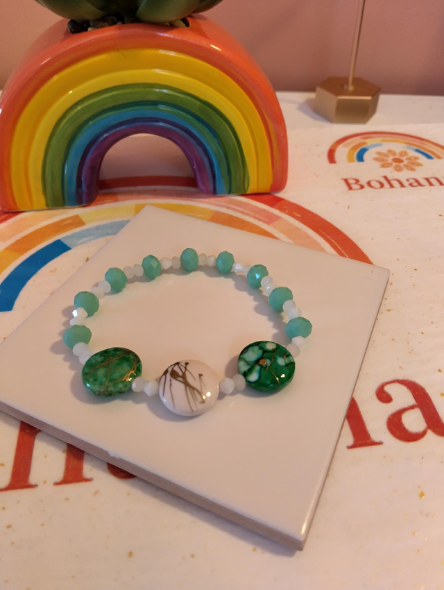 Handmade Green & White Beaded Bracelet with Marbled Stone Accent