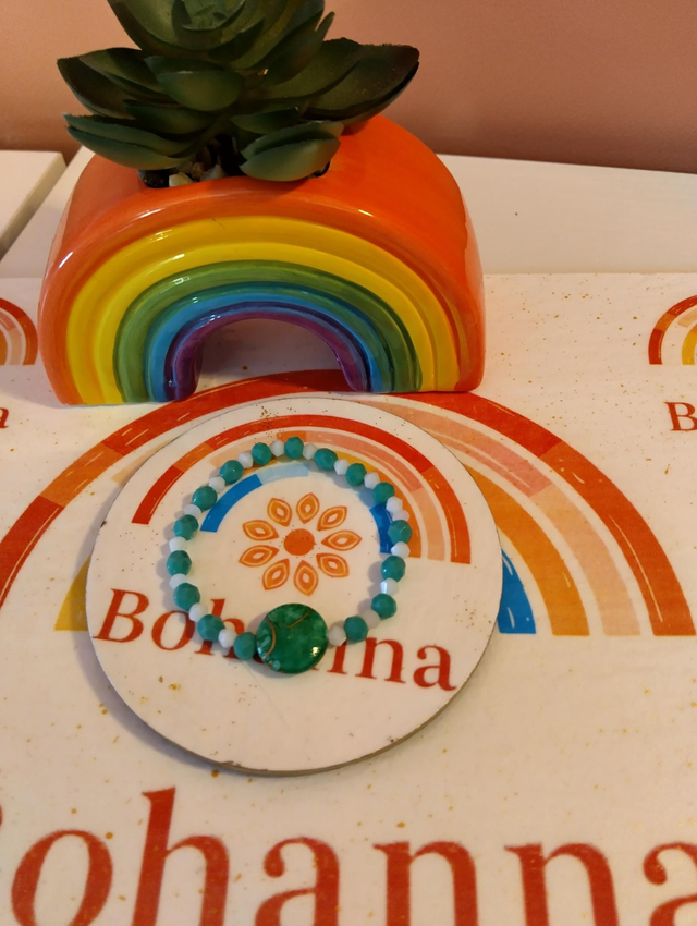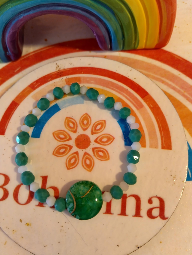 Add a pop of colour and elegance to your everyday style with this handmade green and white beaded bracelet. Featuring faceted green and white beads strung on a durable stretch cord, the design is finished with a striking marbled stone accent bead that makes each piece truly unique.