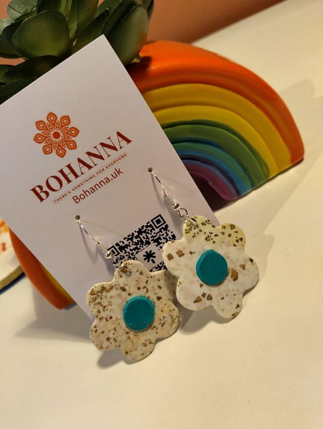 Bright, breezy and beautifully handmade — these white and teal flower earrings are full of coastal charm. Flecked with gold leaf for a touch of sunshine sparkle, they’re light to wear and perfect for everyday style.