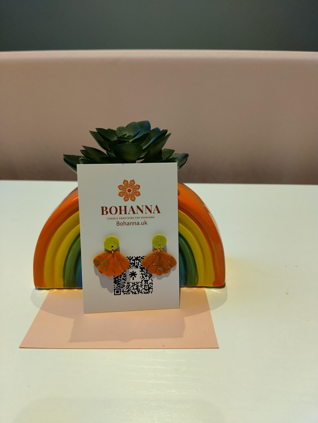 Handmade polymer clay fan earrings in bold orange with subtle gold-leaf accents and lime-green tops. These playful earrings add a joyful burst of colour to your outfit — perfect for fun-loving adults who like to stand out with style.