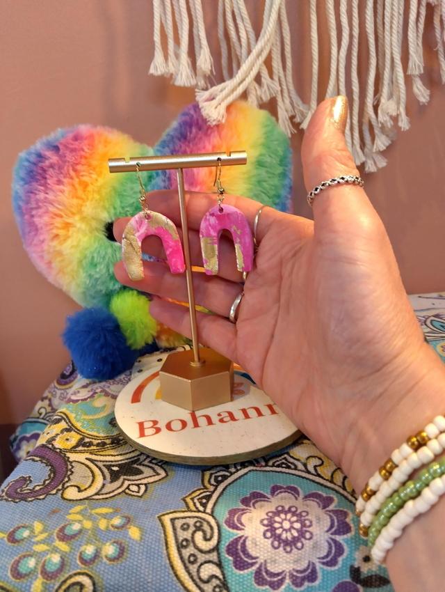 Add a pop of playful elegance to any outfit with these handcrafted polymer clay rainbow earrings. Each piece is carefully sculpted by hand, featuring soft pink hues contrasted with shimmering metallic gold accents for a chic, modern twist on a classic rainbow design. Lightweight and comfortable, these earrings are perfect for everyday wear or adding a touch of whimsy to special occasions.