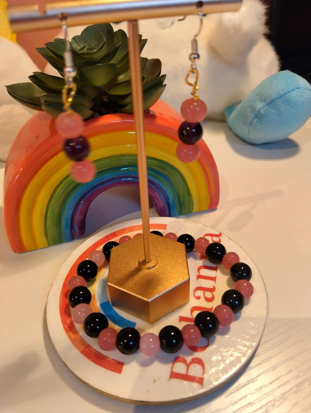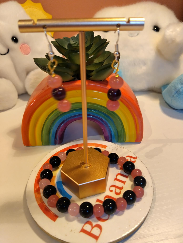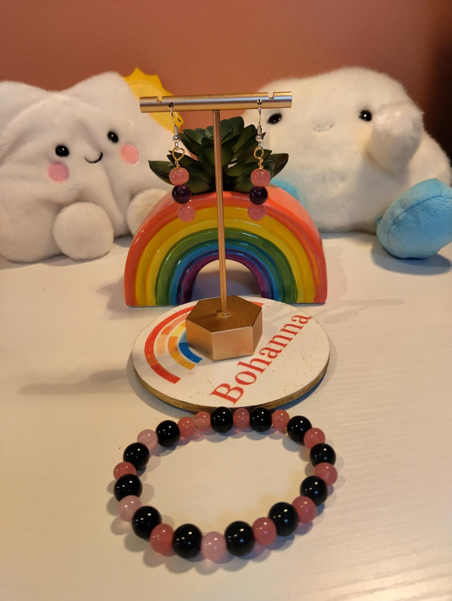 Elegant, bold, and effortlessly boho โ the Midnight Rose Set pairs glossy black and rose-pink beads for a look thatโs both grounding and full of feminine energy. The matching drop earrings and stretch bracelet are handmade with love, designed to bring balance, confidence, and a hint of mystery to your style.