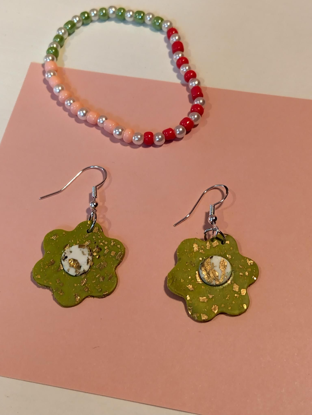 Elegant with a hint of nature’s glow, the Olive Meadow Dangle Earrings are handcrafted in soft green tones with gold leaf shimmer and creamy white centres. The perfect balance of earthy charm and everyday luxury.