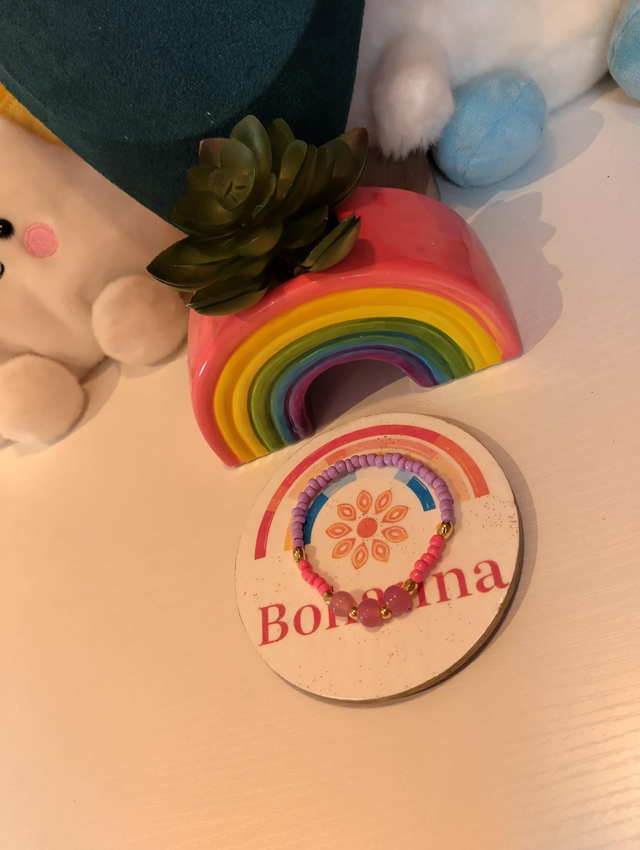 Handcrafted with love, this vibrant beaded bracelet features soft lilac and pink tones, accented with shimmering gold heart and spacer beads for that perfect touch of sunshine. Each piece is designed to capture the playful spirit of rainbows and the relaxed beauty of boho style.